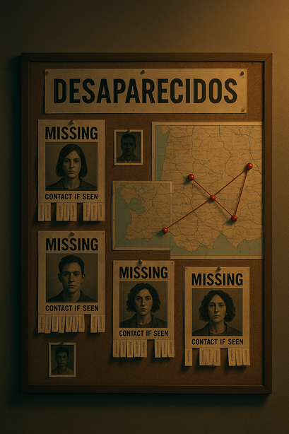 Bienvenidos a “Desaparecidos”, donde los rostros faltantes cobran voz y los huecos en el mapa se convierten en preguntas apremiantes. En este tablero encontrarás pósters que imploran “Contactar si los veas”, retazos de mapas con chinchetas marcando últimas ubicaciones conocidas, y recortes de fotos que nos recuerdan que detrás de cada expediente hay una persona real.