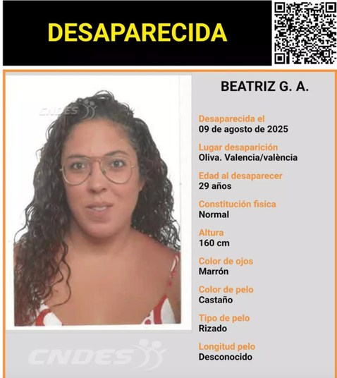 Oliva, comarca de la Safor, provincia de Valencia. En la madrugada del 9 de agosto de 2025, el rastro de Beatriz G. A. —29 años en el registro oficial, 28 en buena parte de la cobertura mediática— se corta sin una explicación pública. La ficha del Centro Nacional de Personas Desaparecidas (CNDES) fija el dato esencial: desaparecida en Oliva, 1,60 m de estatura, 70 kg, ojos marrones, pelo castaño; el resto es silencio administrativo y una investigación que, a esta hora, sigue abierta. CNDES
